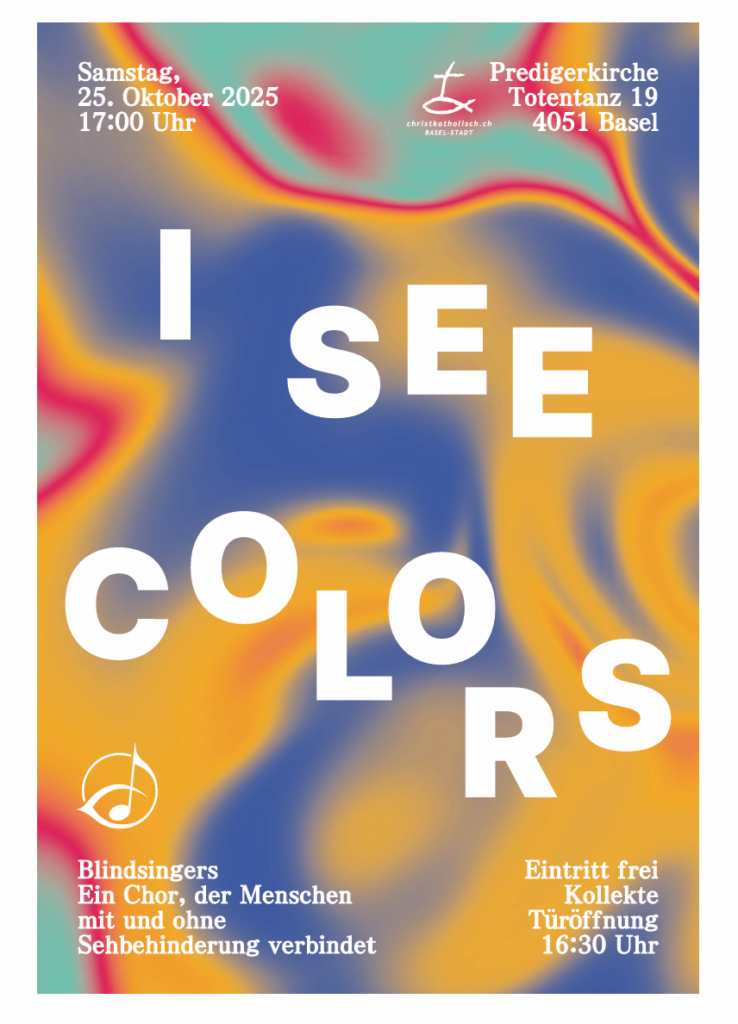 Am Samstag, 25. Oktober 2025, findet um 17:00 Uhr in der Predigerkirche Basel (Totentanz 19, 4051 Basel) das Konzert unter dem Titel „I see colors“ statt. Die Blindsingers freuen sich, dem Publikum ein abwechslungsreiches Programm rund um das Thema Farben zu präsentieren. Zudem werden die Blindsingers über die Bedeutung und ihre Wahrnehmung von Farben berichten.